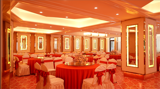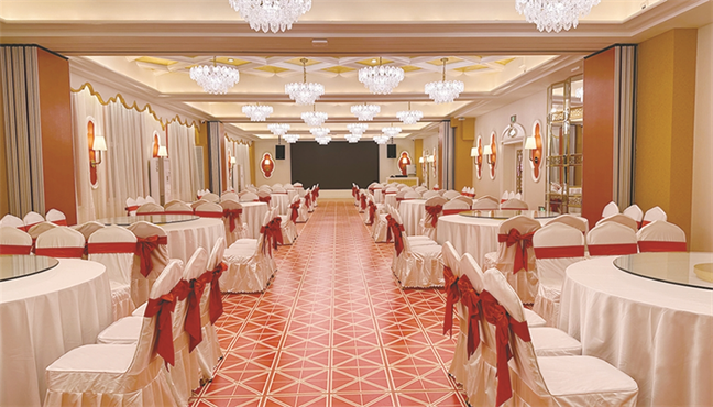 太陽廳—面積323㎡,兼做早餐廳,可供 140人同時(shí)用餐;午晚時(shí)段,可改做宴會(huì)廳使用, 能夠承接16桌以下的宴席。
